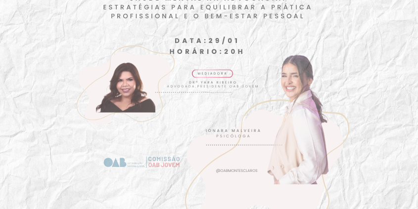 No próximo dia 29/1, às 20h, a OAB Jovem promoverá uma Live especial sobre saúde mental na Advocacia. O evento, inserido na campanha “Janeiro Branco”, terá como tema “Saúde mental na Advocacia: estratégias para equilibrar a prática profissional e o bem-estar pessoal”.